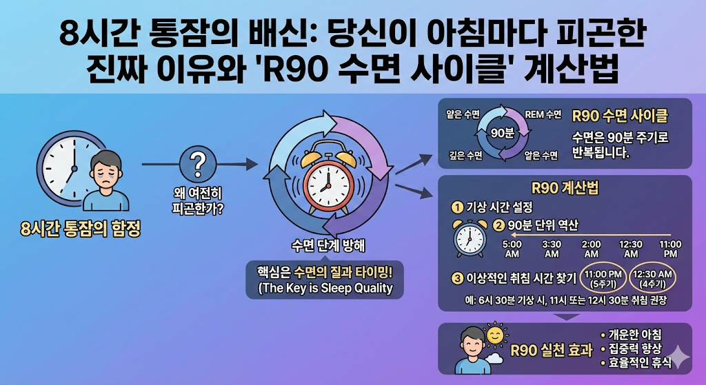 - Meta Description: 8시간을 자도 피곤한가요? 문제는 수면 시간이 아니라 '주기'입니다. 아침 피로를 싹 없애주는 R90 수면 사이클 계산법과 렘수면 활용 팁을 공개합니다.