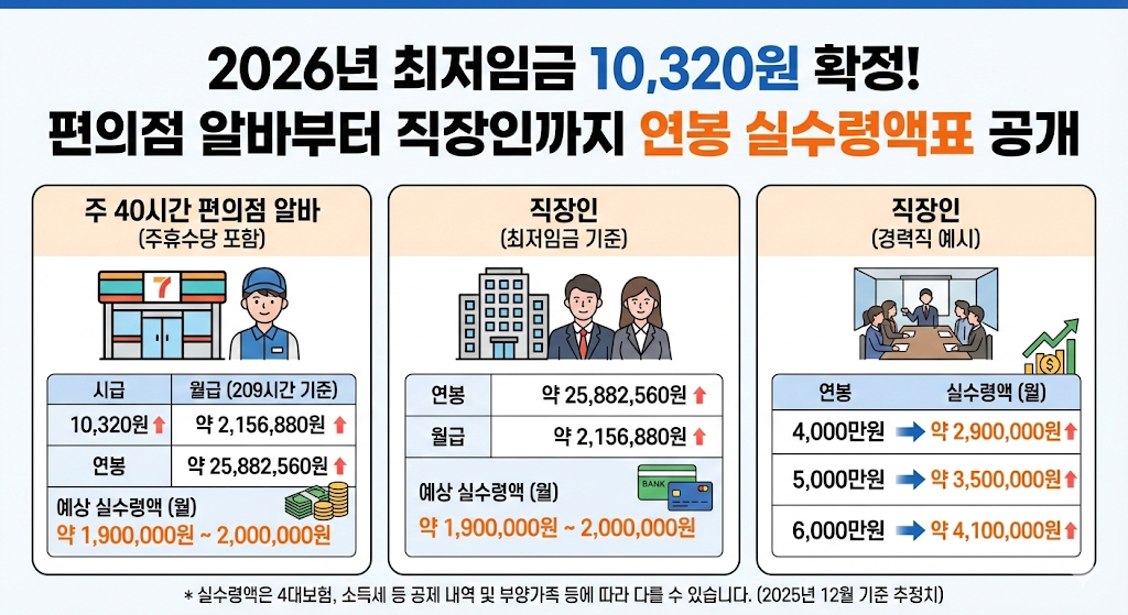 2026년 최저임금 10,320원 확정! 편의점 알바부터 직장인까지 연봉 실수령액표 공개