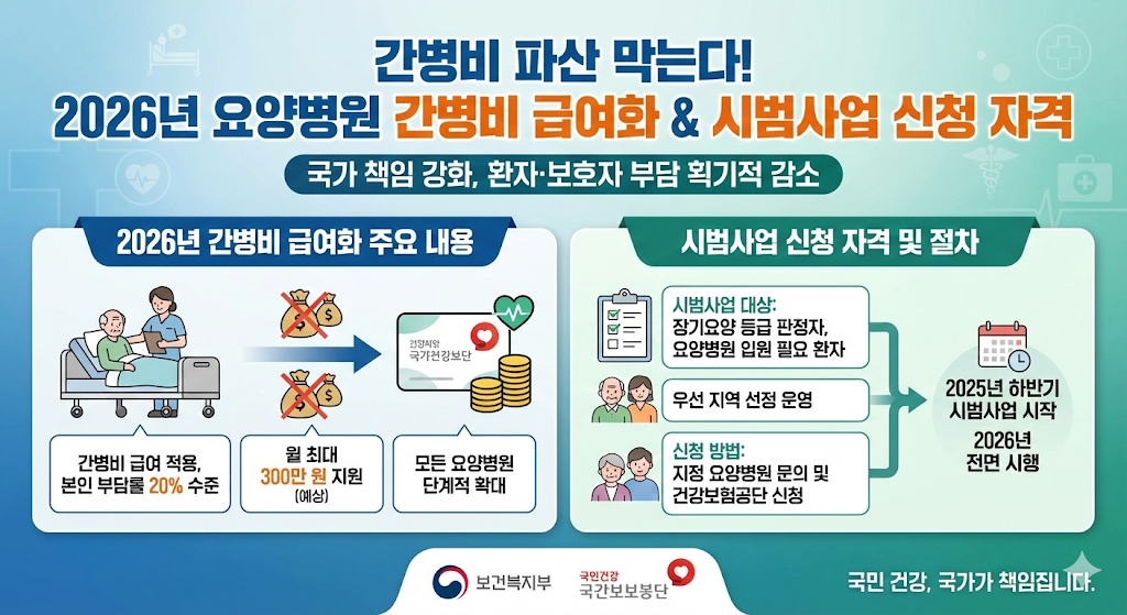 국민건강보험공단 홈페이지에서 '2026년 간병지원 시범사업 참여기관' 명단을 확인하고 상담 예약을 잡으세요. 정보가 곧 돈입니다.