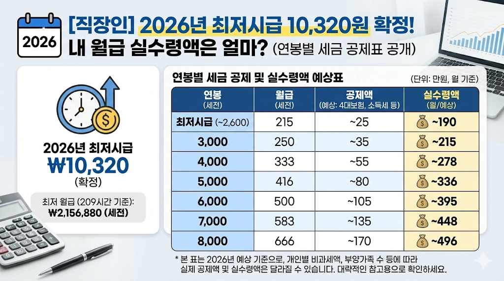 2026년 최저시급 10,320원 확정! 내 월급 실수령액은 얼마? (연봉별 세금 공제표)